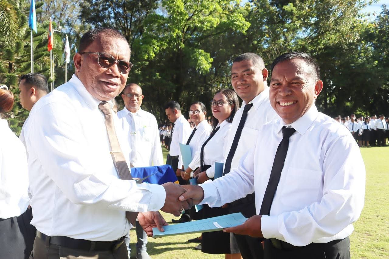 Penyerahan SK dilakukan secara simbolis oleh Rektor Unpatti, Prof. Dr. Fredy Leiwakabessy, M.Pd, kepada 20 orang perwakilan PPPK dalam Apel bersama yang berlangsung di lapangan Rektorat, Senin (6/10/2025).