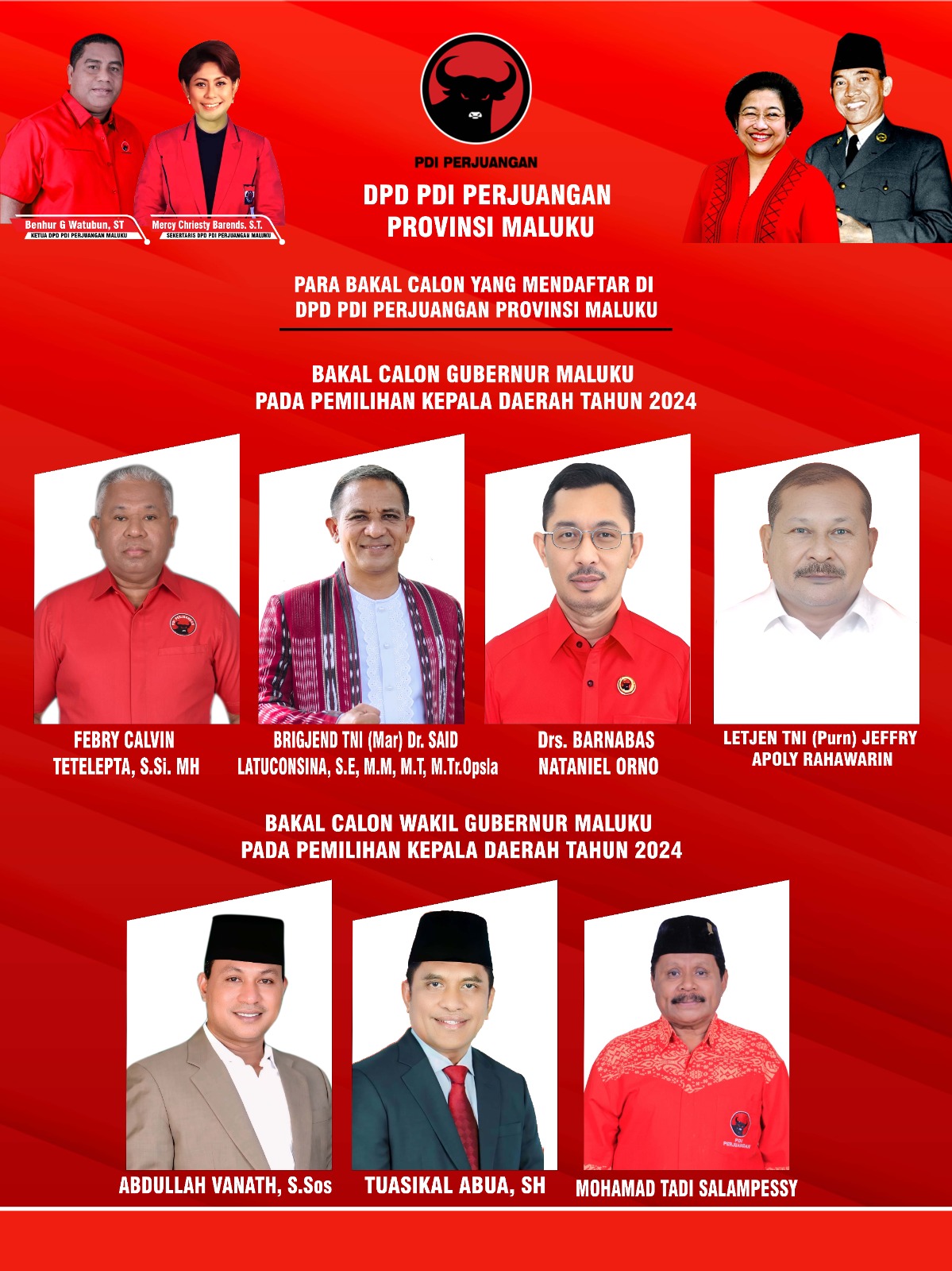Mereka adalah, Febri Calvin Tetelepta (Deputi I Kepala Staf Presiden), Said Latuconsina (Danlantamal Ambon), Barnabas Orno (Mantan Wakil Gubernur Maluku), dan Jefri Apoli Rahawarin (Mantan Pangdam Pattimura). Sementara balon Wakil Gubernur, yakni Abdullah Vanath (mantan Bupati SBT dua periode), Tuasikal Abua (mantan Bupati Malteng dua periode), dan Tadi Salampessy (kader PDIP).