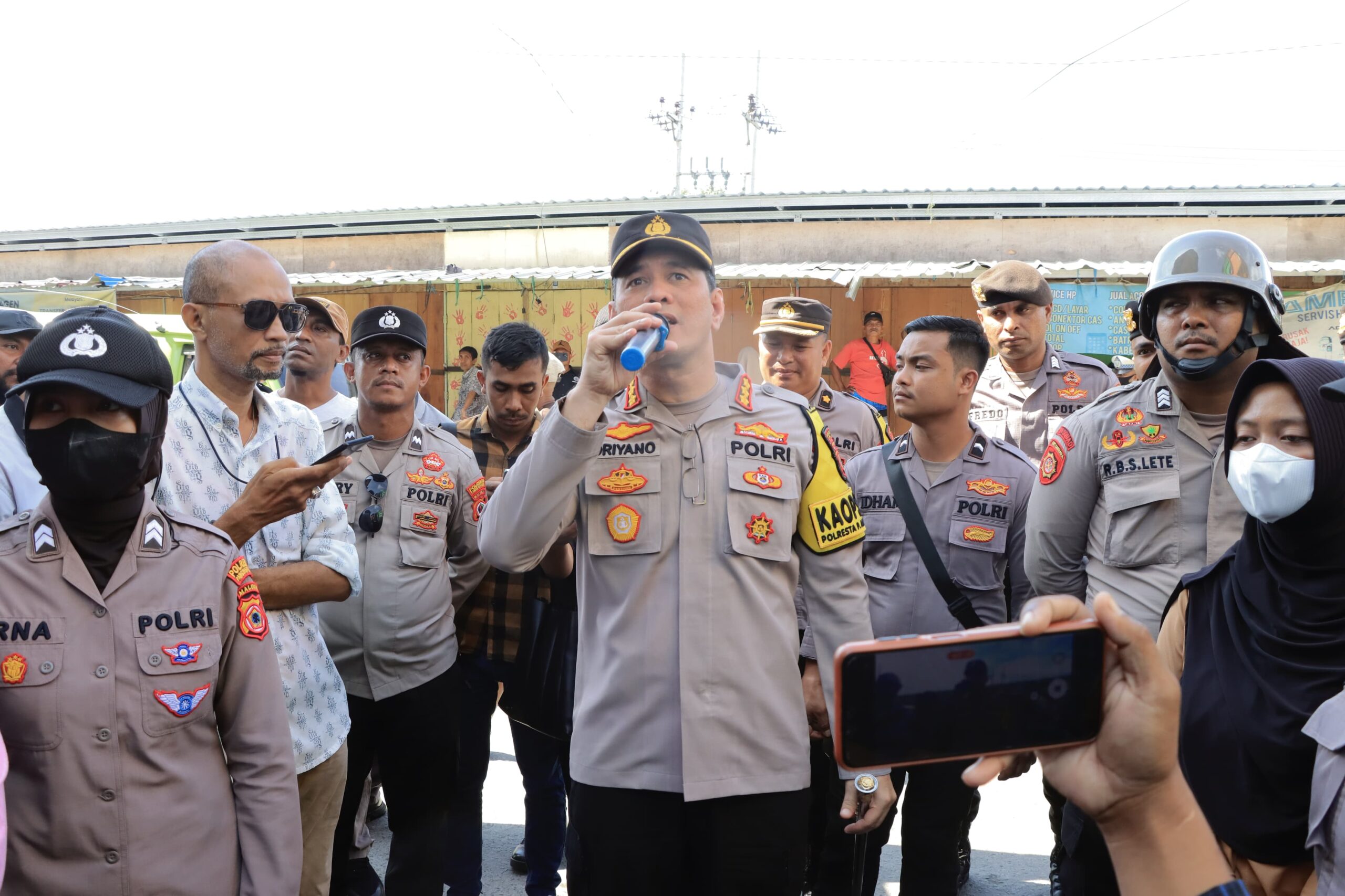 AMBON,DM.COM,-Kapolresta Pulau Ambon dan Pp Lease, Kombes Pol Driyano Andri Ibrahim turun langsung melakukan pengamanan penertiban pedagang pasar Mardika, Selasa (9/1/2024).