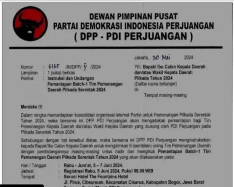 “Dalam rangka memantapkan konsolidasi tim pemenangan organisasi internal partai untuk pemenangan Pilkada seretak 2024,,maka bersama ini DPP PDIP akan mengadakan pemantapan bagi tim pemenangan calon kepala daerah dan wakil kepala daerah yang diusung PDIP pada Pilkada serentak 2024 mendatang,”demikian surat DPP PDIP.