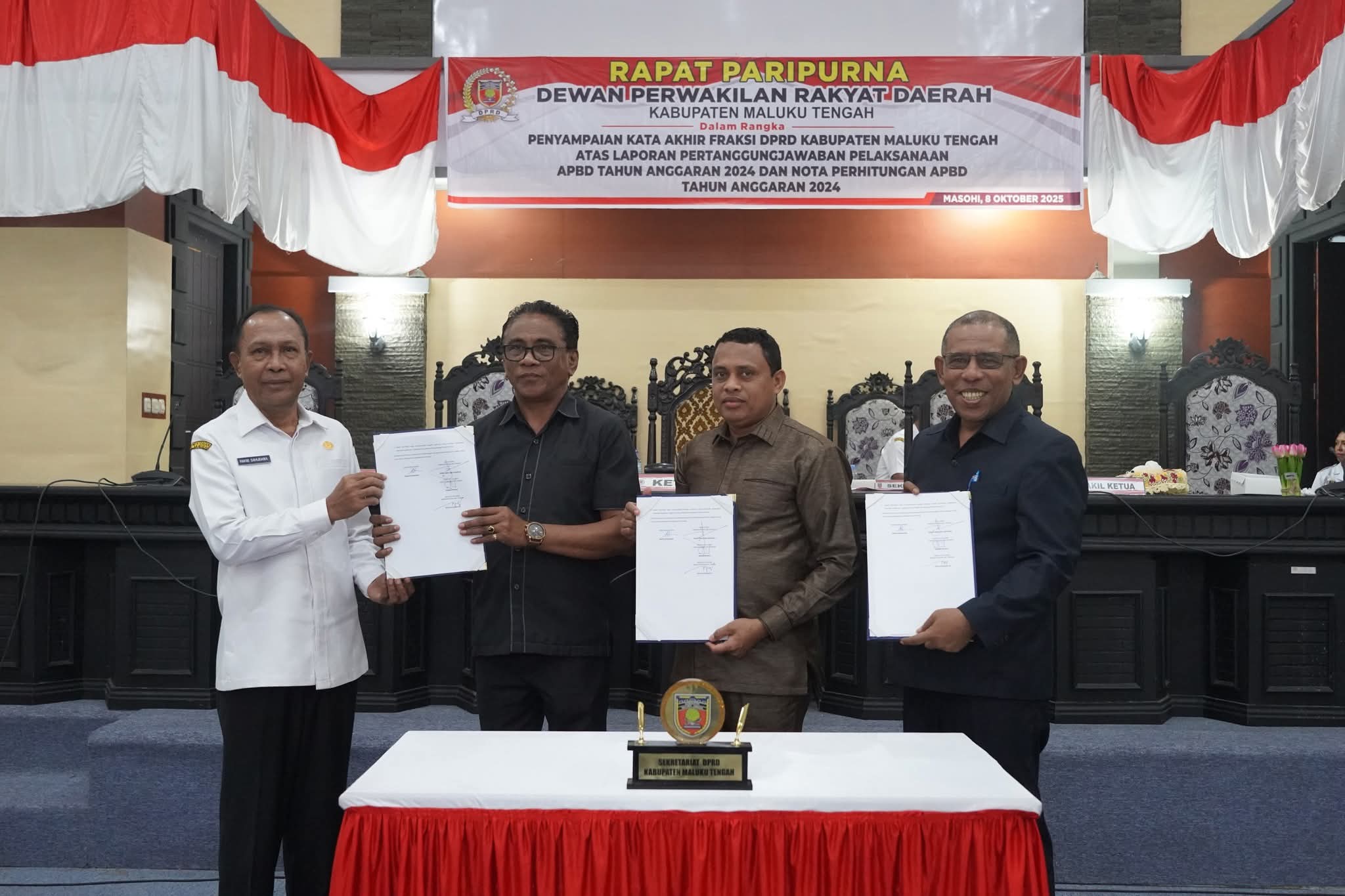 Pada kesempatan itu delapan fraksi DPRD Malteng, menerima Laporan Pertanggungjawaban atas Laporan Pelaksanaan APBD 2024 saat Rapat Paripurna Penyampaian Kata Akhir Fraksi Laporan Pertanggungjawaban atas Laporan Pelaksanaan APBD Tahun Anggaran 2024 dan Nota Perhitungan APBD Tahun Anggaran 2024.