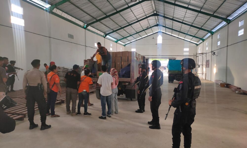 AMBON,DM.COM,-Aparat Polres Kepulauan Aru mengamankan surat suara Pemilu 2024 yang tiba dengan KMP Lobster di Pelabuhan Dobo, Rabu (13/12/2023). Surat suara yang masuk untuk pemilihan DPR...