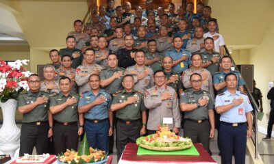 AMBON,DM.COM,-Pangdam XVI/Pattimura Mayjen TNI Ruruh A. Setyawibawa, didampingi Danlantamal IX/Ambon Brigjen TNI Said Latuconsina, dan Danlanud Pattimura Ambon Kolonel Pnb Tiopan Hutapea, memberikan surprise kue ultah...
