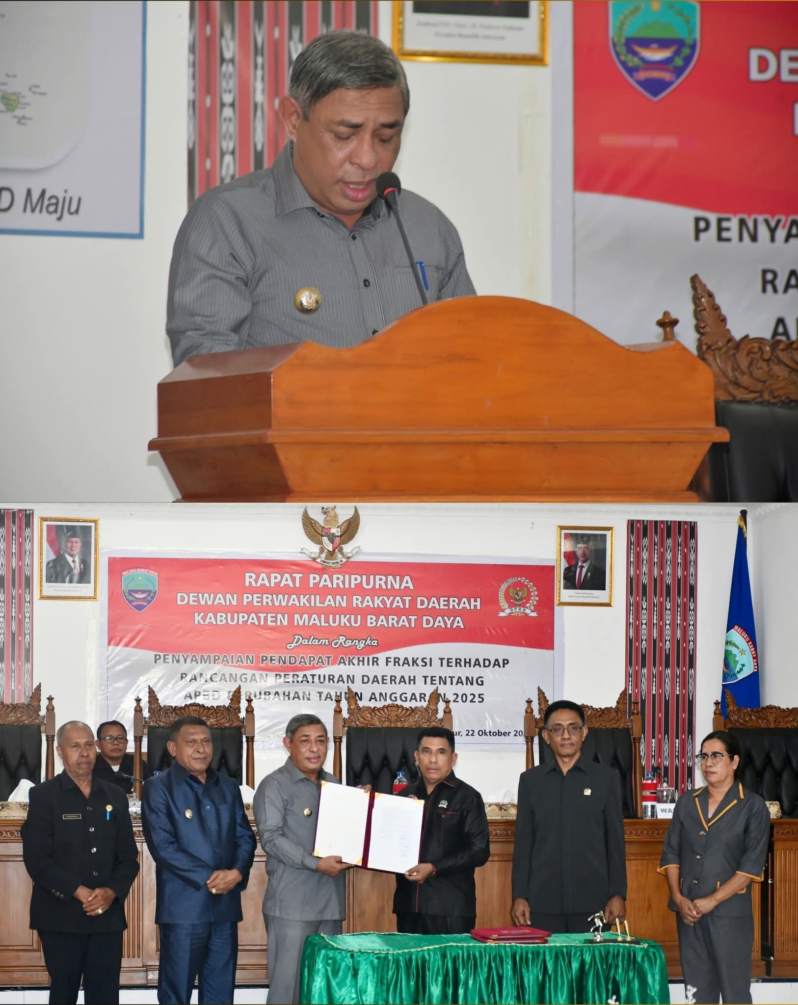 AMBON,DM.COM,-Dewan Perwakilan Rakyat Daerah (DPRD) Kabupaten Maluku Barat Daya (MBD) akhirnya menyetujui Rancangan Peraturan Daerah tentang APBD Perubahan (APBD-P) Tahun Anggaran (TA) 2025. Perserujuan APBD-P, diapresiasi Bupati MBD, Benyamin Thomas Noach.
