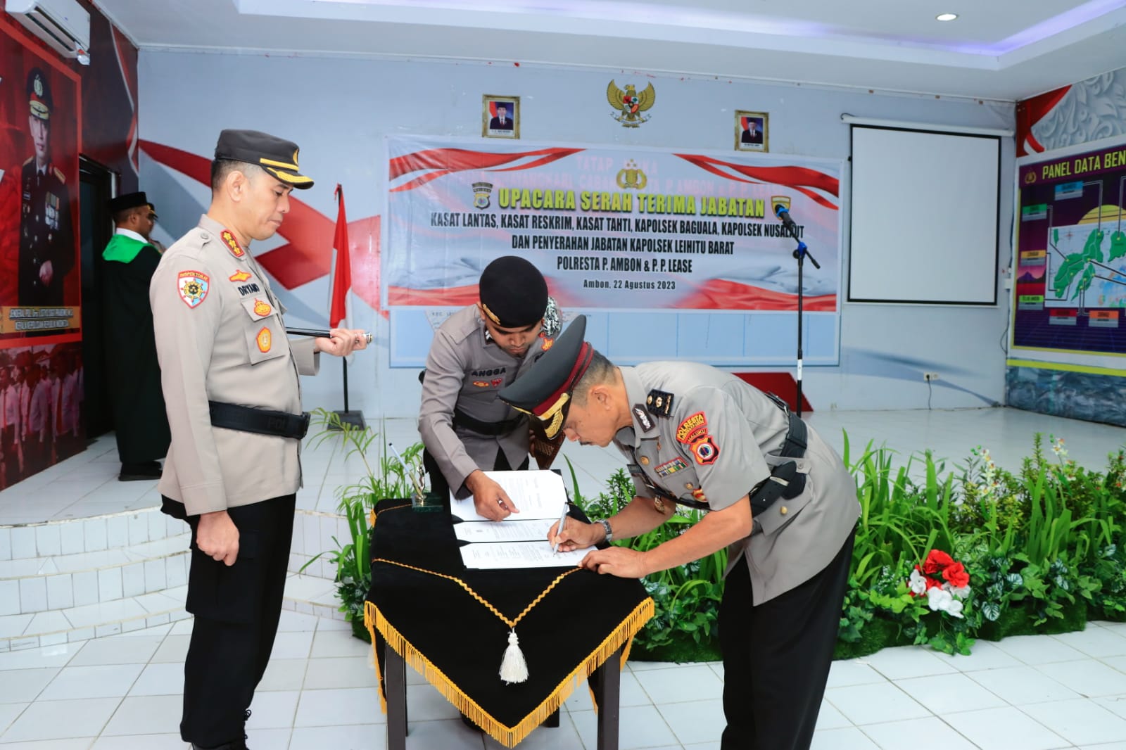 Posisi yang diserahkan terimakan, yakni Kasat Reskrim, Kasat Lantas, Kasat Tahti, Kapolsek Baguala, Kapolsek Nusalaut dan Penyerahan Jabatan Kapolsek Leihitu Barat Polresta Pulau Ambon dan Pulau-pulau Lease.