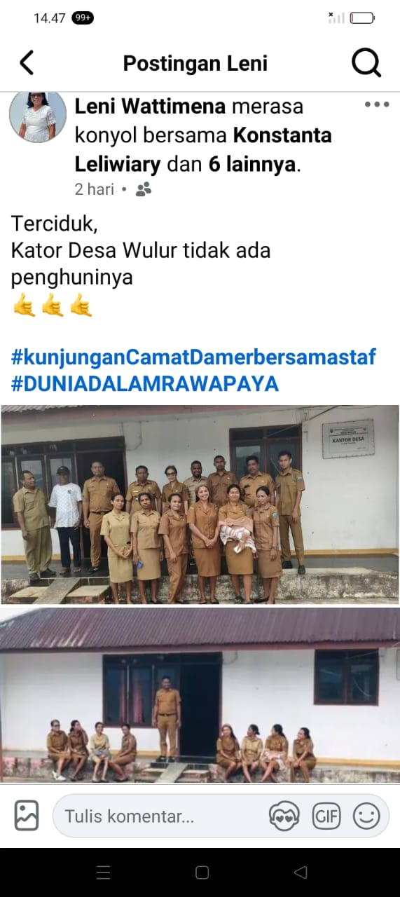 Dia mengaku, Camat Damer, Feri Leinussa bersam staf mengunjungi kahtor Desa Wulur, untuk mengecek aktivitas di kantor desa tersebut, setelah mendapat laporan dari warga. Bahkan ada warga atau staf kantor Camat melalui statusnya di Facebook kalau kantor Desa Wukur terciduk tidak ada penghuninya.