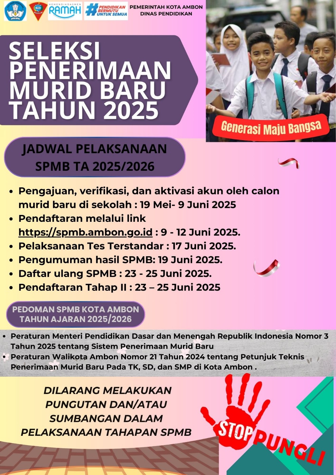 Untuk memastikan tersampaikannya informasi Perubahan Jadwal Tes Terstandar, Dinas Pendidikan Kota Ambon telah menginstruksikan kepada pihak sekolah untuk menginformasikan Perubahan Jadwal Tes Terstandar melalui Flyer ke Grup-grup Whatsapp (WA) para Orang Tua Siswa.(DM-04)