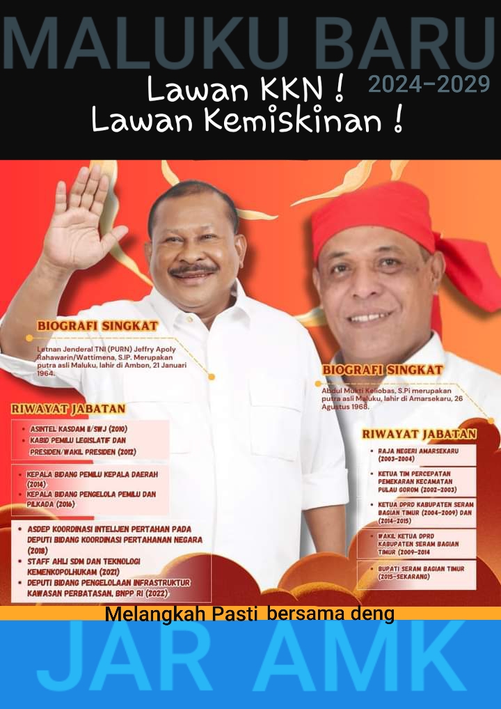 Kedua putra terbaik Maluku yang berbeda latar belakang Jeffry Apoloy Rahwarin disapa JAR adalah seorang perwira tinggi TNI (purn) yang mumpuni, sementara Abdul Mukti Kaliobas yang disapa (MK) hadir dengan latar belakang seorang politisi dan birokrat Bupati masih aktif.