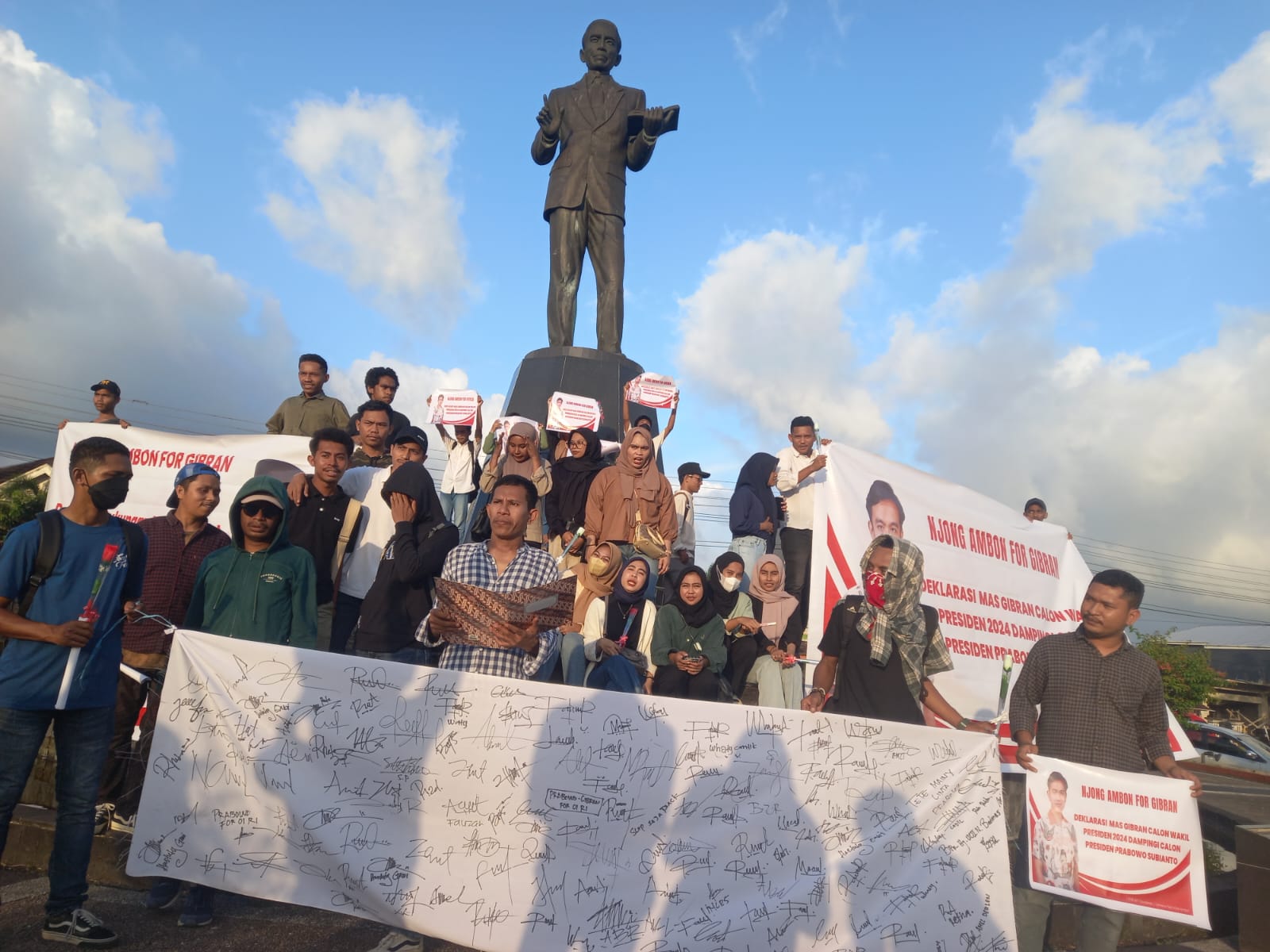 Dukungan dalam bentuk deklarasi Gibran berpasangan dengan Prabowo, berlangsung di Bundaran Patung J. Laimena, Desa Poka, Kota Ambon, Kamis, (12/10/2023).