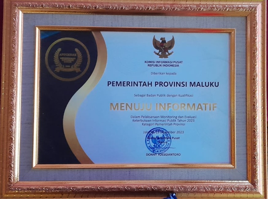 Untuk Pemerintah Provinsi Maluku pada Tahun 2023 ini menerima Penghargaan pada Kualifikasi Menuju Informatif untuk Kategori Pemerintah Provinsi, dengan poin 87,03, yang diserahkan secara langsung oleh Komisioner KIP Bidang Penyelesaian Sengketa Informasi Syawaludin.