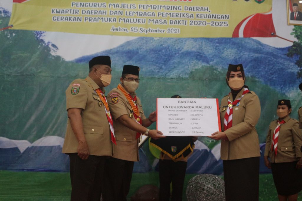 Usai pelantikan, Ketua Kwarnas juga menyerahkan Alat Pelindung Diri (APD) dan sejumlah Piagam Apresiasi kepada Kwarda Gerakan Pramuka Maluku, serta Piagam Ucapan Terima Kasih kepada Relawan Covid-19. (Biro Adpim Setda Maluku).