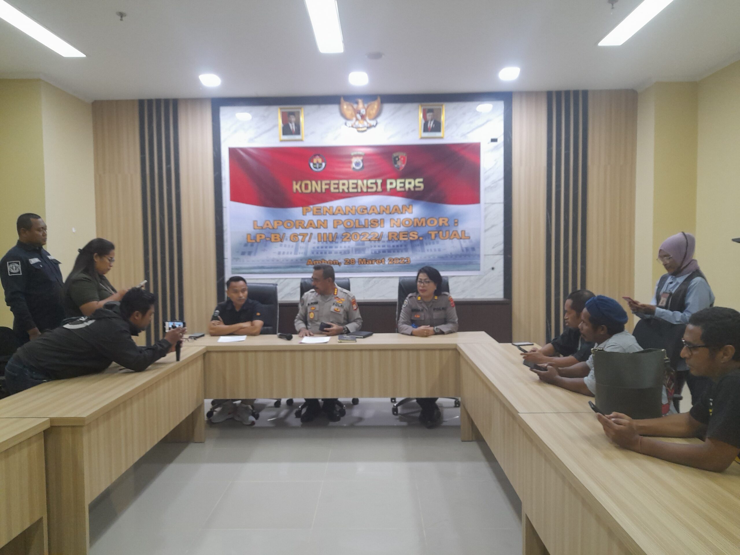 “Bareskrim Mabes Polri dan Direskrimum Polda Maluku menghentikan kasus perkara Laporan Polisi Nomor : LP-B/67/III/2022/SPKT/RES TUAL / POLDA MALUKU, tanggal 28 Maret 2022,”Kabid Humas Polda Maluku, Kombes Pol M. Roem Ohoirat didampingi Direskrimum Polda Maluku Kombes Andri Iskandar dan Kasubdid Bidhumas Polda Maluku AKP Imelda Haurissa, kepada awak media di Polda Maluku, Selasa (28/3/2023).