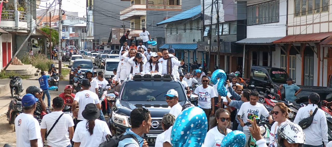 Para pendukung yang menaiki ratusan mobil, sepeda motor, sementara yang lainya berjalan kaki mengantarkan MS-KK yang diusung Partai NasDem, Partai Perindo, PAN, Partai Buruh, PBB, dan PPP, usai deklarasi melewati sejumlah ruas jalan utama di Kota Saumlaki, ibukota KKT.