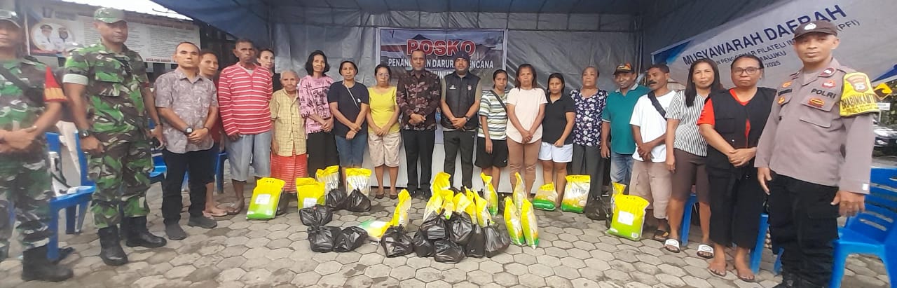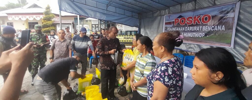 Kehadiran orang pertama dibumi Pamahanunusa itu membagikan paket sembako kepada warga Hunuth yang rumahnya terbakar di Posko Penanganan Darurat Bencana di Kantor Desa Hunuth, Sabtu (23/8/2025).