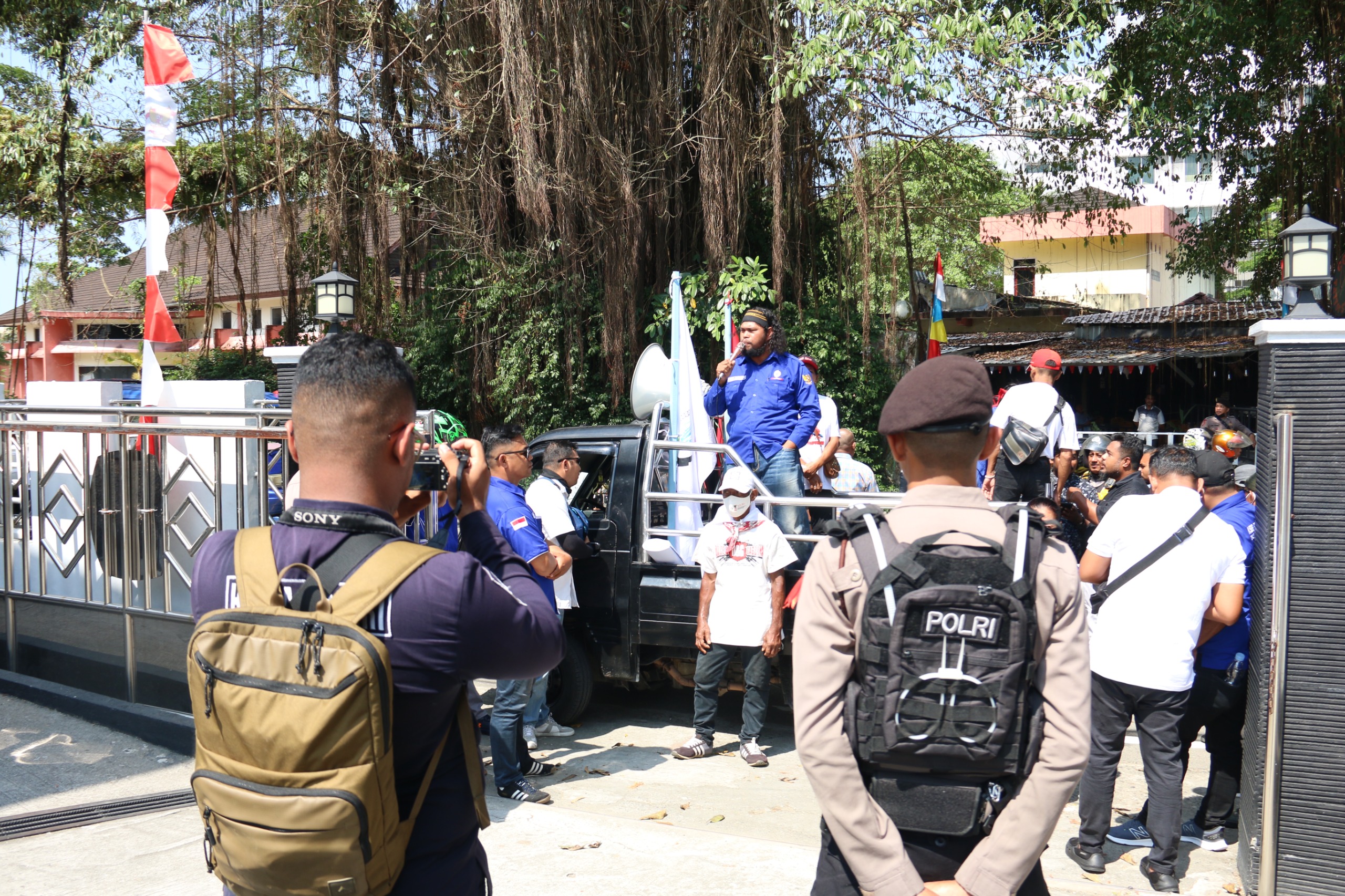Aksi damai yang dipimpin Ketua KSBSI Maluku, Demas Luanmase, ini dilaksanakan di Kantor Komisi Pemilihan Umum (KPU) Provinsi Maluku, Selasa (14/11/2023).
