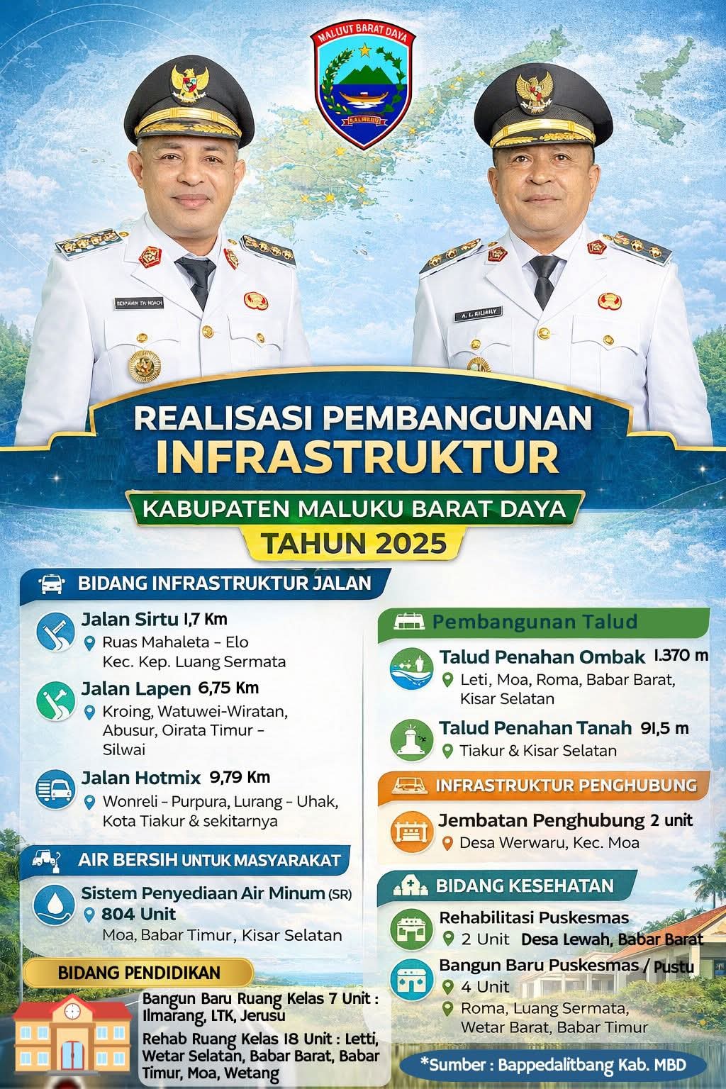 AMBON,DM.COM,-Meski satu tahun pemerintahan Bupati dan Wakil Bupati Maluku Barat Daya (MBD), Benyamin Thomas Noach dan Agustinus Lekwardai Kilikily, dihadang efesiensi anggaran dan pemotongan transfer ke daerah, namun Noach dan Kilikily akrab disapa BTN-Ari, berhasil membangun sejumlah infrastruktur dasar yang sudah dinikmati warga di bumi Kalwedo di tahun 2025 lalu.