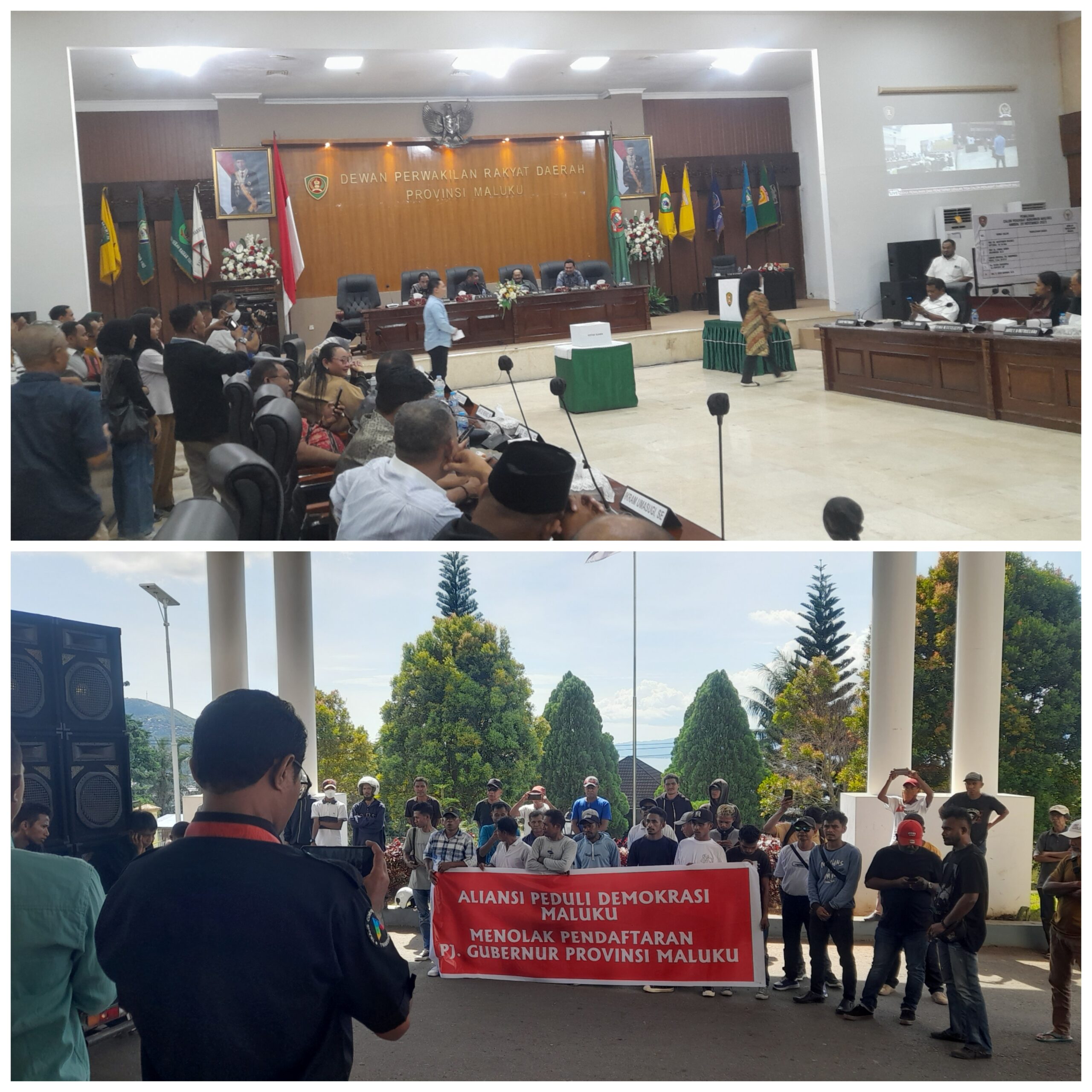 Meski proses pemilihan sementara berlangsung aksi demo digelar di depan kantor DPRD Provinsi Maluku. Kehadiran Aliansi Peduli Demokrasi Maluku, menolak proses pendaftaran yang dilakukan Tim Panitia Kerja Penjaringan DPRD Provinsi Maluku.