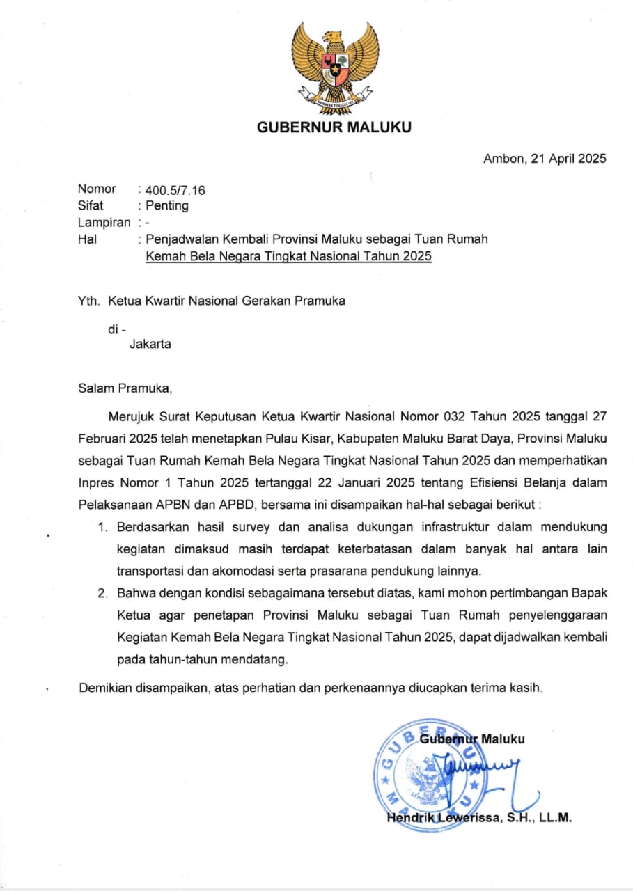 Surat berkop burung Garuda dan dicap Gubernur Maluku itu ditujukan kepada Ketua Kwartir Nasional Pramuka di Jakarta. Surat Gubernur menyebutkan, bahwa merujuk surat keputusan Ketua Kwartir Nasional Pramuka Nomor 032 Tahun 2025 tanggal 27 Februari 2025 telah menetapkan Pulau Kisar, Kabupaten MBD, Provinsi Maluku sebagai tuan rumah Kemah Bela Negara Tingkat Nasional 2025 telah memperhatikan Inpres Nomor 1 Tahun 2025 tertanggal 22 Januari 2025 tentang efesiensi belanja dalam pelaksanaan APBN dan APBD.