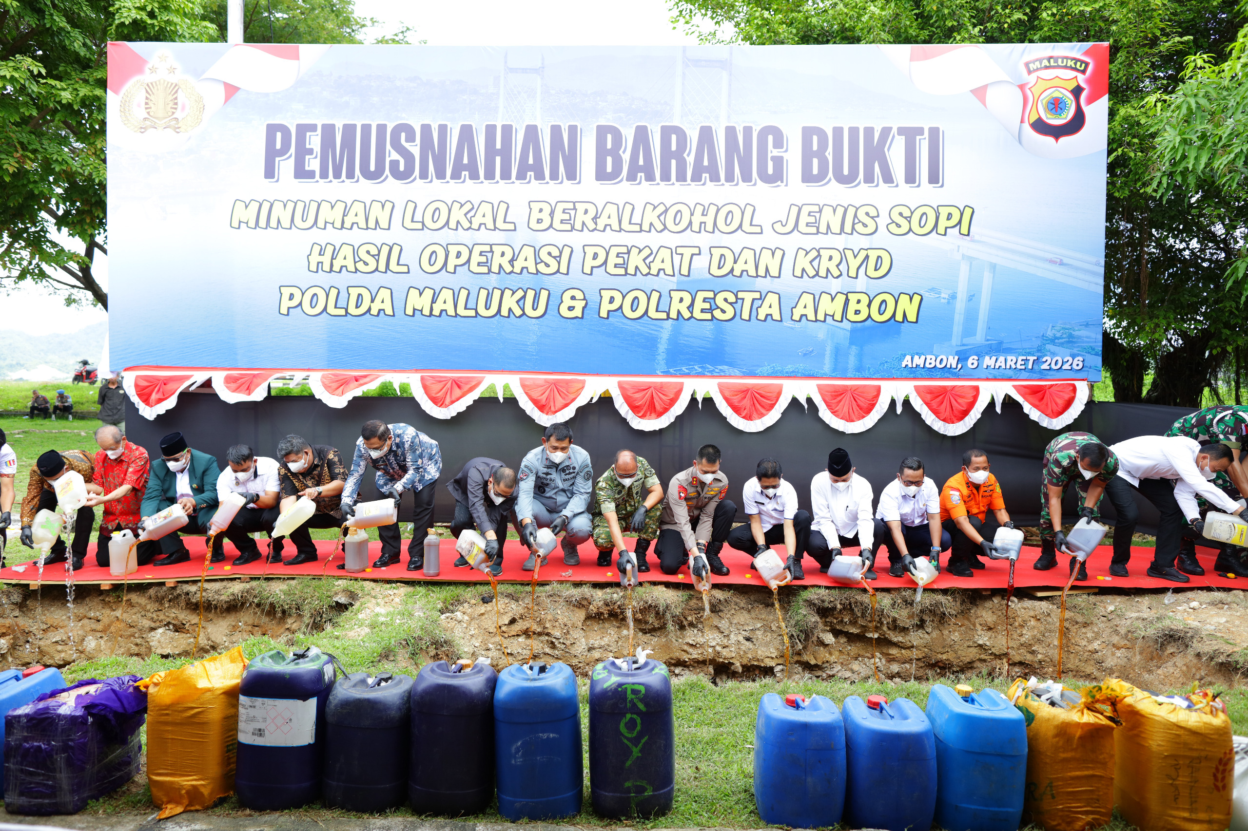 Kegiatan diakhiri dengan pemusnahan secara simbolis, di mana Kapolda bersama jajaran Forkopimda menuangkan miras sopi ke dalam kolam pemusnahan yang telah disediakan. Selanjutnya dilakukan penandatanganan Berita Acara Pemusnahan oleh Kapolda Maluku, Sekda Maluku, Kapok Sahli Pangdam XV/Pattimura, Kepala Bakamla Maluku, serta pejabat instansi terkait lainnya sebagai bentuk legalitas formil atas pemusnahan barang sitaan tersebut.