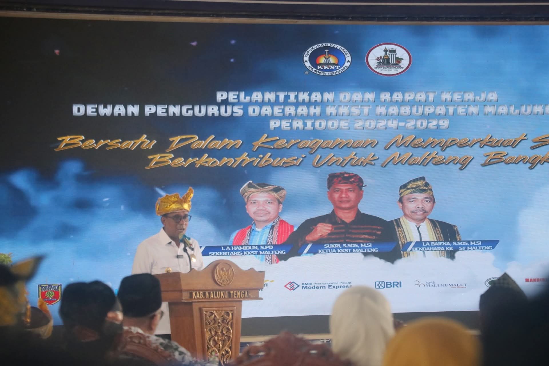 Pernyataan Bupati Malteng usai diberikan Kampurui secara langsung oleh Sultan Buton ke-41, La Ode Muhammad Sjamsul Qamar di sela-sela Pelantikan dan Rapat Kerja Pengurus Daerah Kerukunan Keluarga Sulawesi Tenggara (KKST) Maluku Tengah periode 2024–2039 di Baileo Soekarno, Kota Masohi, Rabu (2/7/2025).
