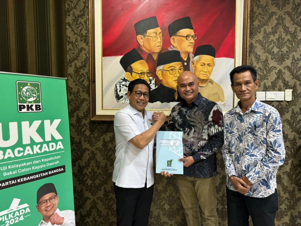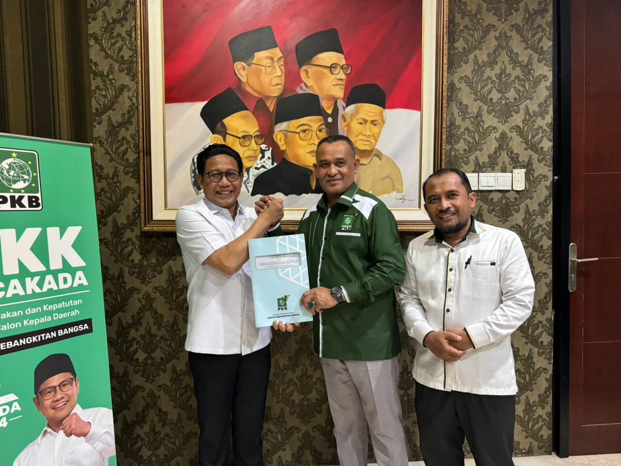 Wakil Ketua Umum DPP PKB Abdul Halim Iskandar, menyerahkan rekomendasi PKB kepada Umasugy dan Kaidel di Kantor DPP PKB, Jakarta Pusat, Selasa (28/5/2024).