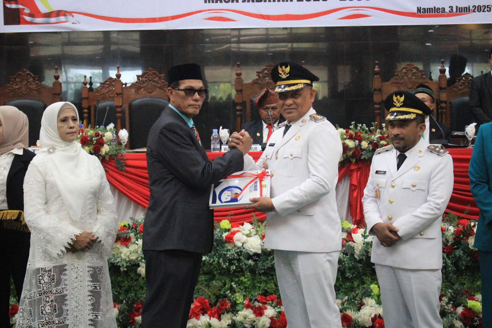 NAMLEA,DM.COM,- Bupati Buru Masa Jabatan 2025-2030 Ikram Umasugi, menyampaikan pidato perdananya dalam Rapat Paripurna Dewan Perwakilan Rakyat Daerah (DPRD) Kabupaten Buru di Gedung DPRD Kabupaten Buru, Selasa (3/6/2025).