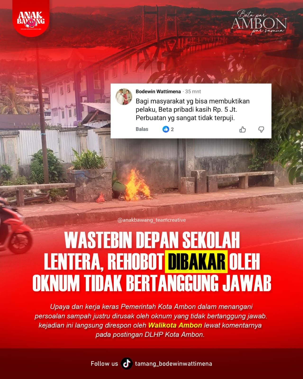 Ini setelah Wasterbin di depan Sekolah Lentera, Rehoboth, Kelurahan Kudamati, Kecamatan Nusaniwe, dibakar oleh orang yang tidak bertanggungjawab, Kamis (12/3/2026).
